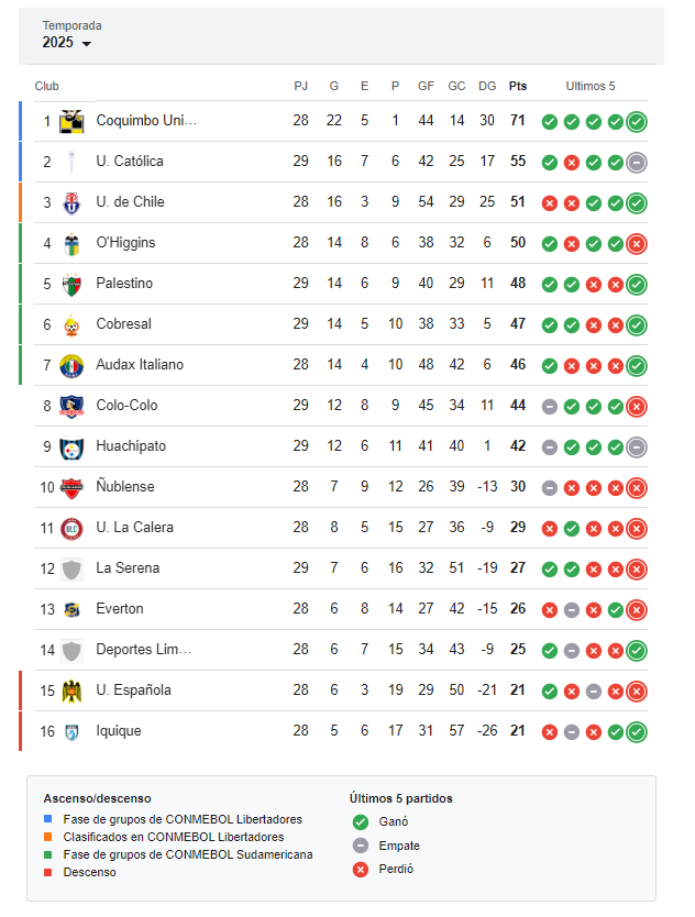 Palestino consiguió esta tarde una victoria clave por 3-0 frente a Deportes La Serena, resultado que no solo consolida su cierre de temporada, sino que además lo instala en zona de clasificación a Copa Sudamericana 2026, desplazando a Colo Colo de puestos internacionales según la tabla acumulada 2025.